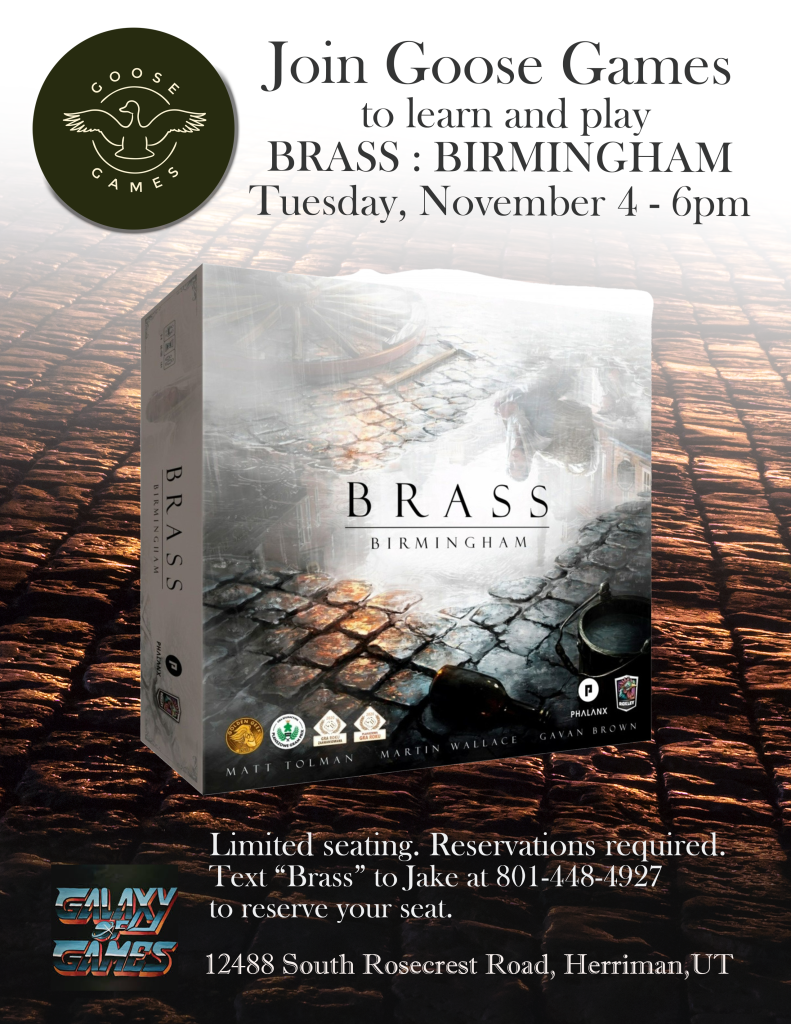 Goose Games is coming to Galaxy of Games in Herriman with a brand new way to enjoy the board game experience. On Tuesday, November 4th at 6:oopm we will be hosting a reservation only event where we will be teaching and playing Brass:Birmingham