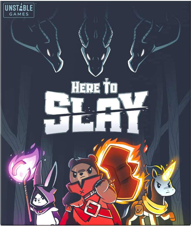 Here to Slay is a fast-paced competitive fantasy strategy card game where players build a party of heroes to defeat formidable monsters and sabotage their opponents. The game combines elements of set collection, role-playing dice rolling, and direct player interaction.