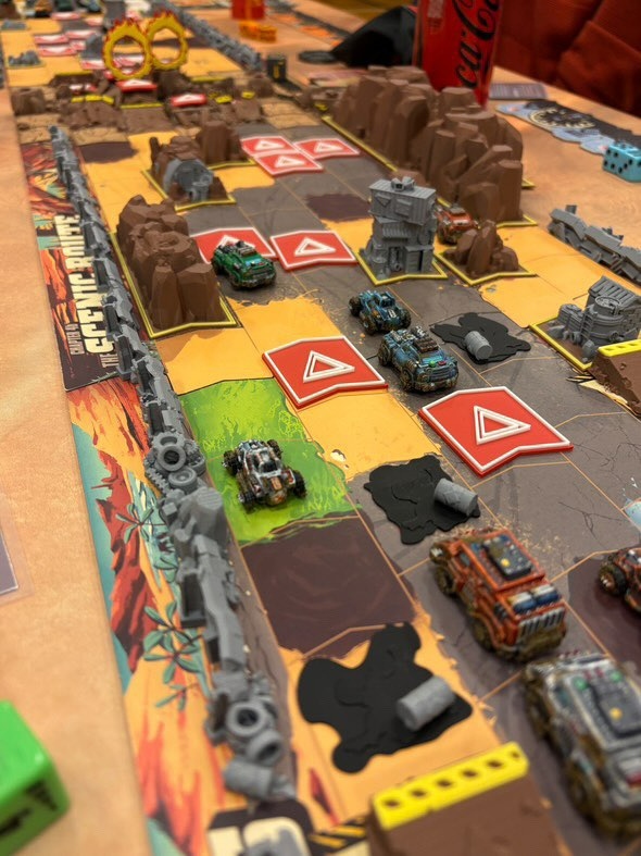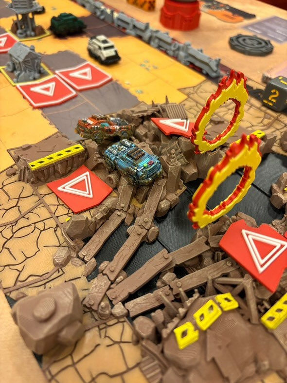 The new 2023 version features exciting new additions, including random hazard tokens, such as wrecks, oil slicks, and more. Damage isn’t merely one and done. Now, you’ll draw damage tokens with exciting effects that can send your car careening across the board. You’ll also have more choices on your turn, assigning one of your dice to your command board to repair damage, nitro boost, or send out your attack copter to fire away.