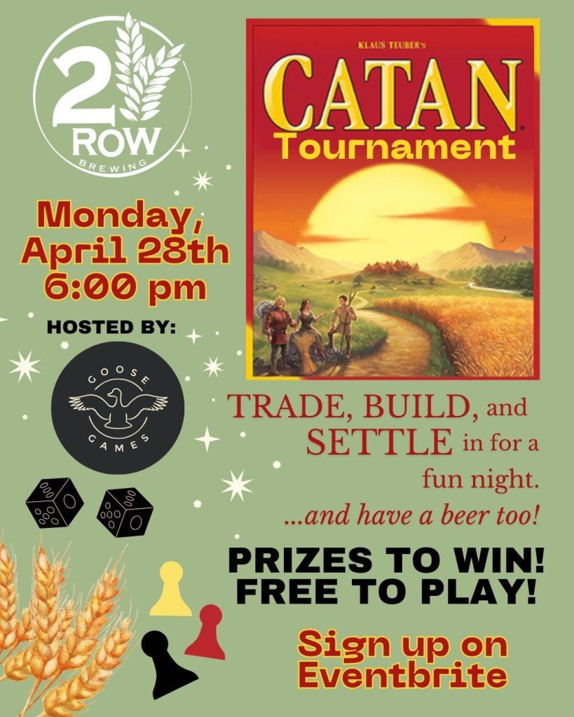 By popular request! Join us for a fun evening of strategy and fun competition at 2 Row Brewing in Midvale, hosted by Goose Games! Bring your Catan loving friends and test your skills on Monday, Apr 28 starting at 6:00 PM.